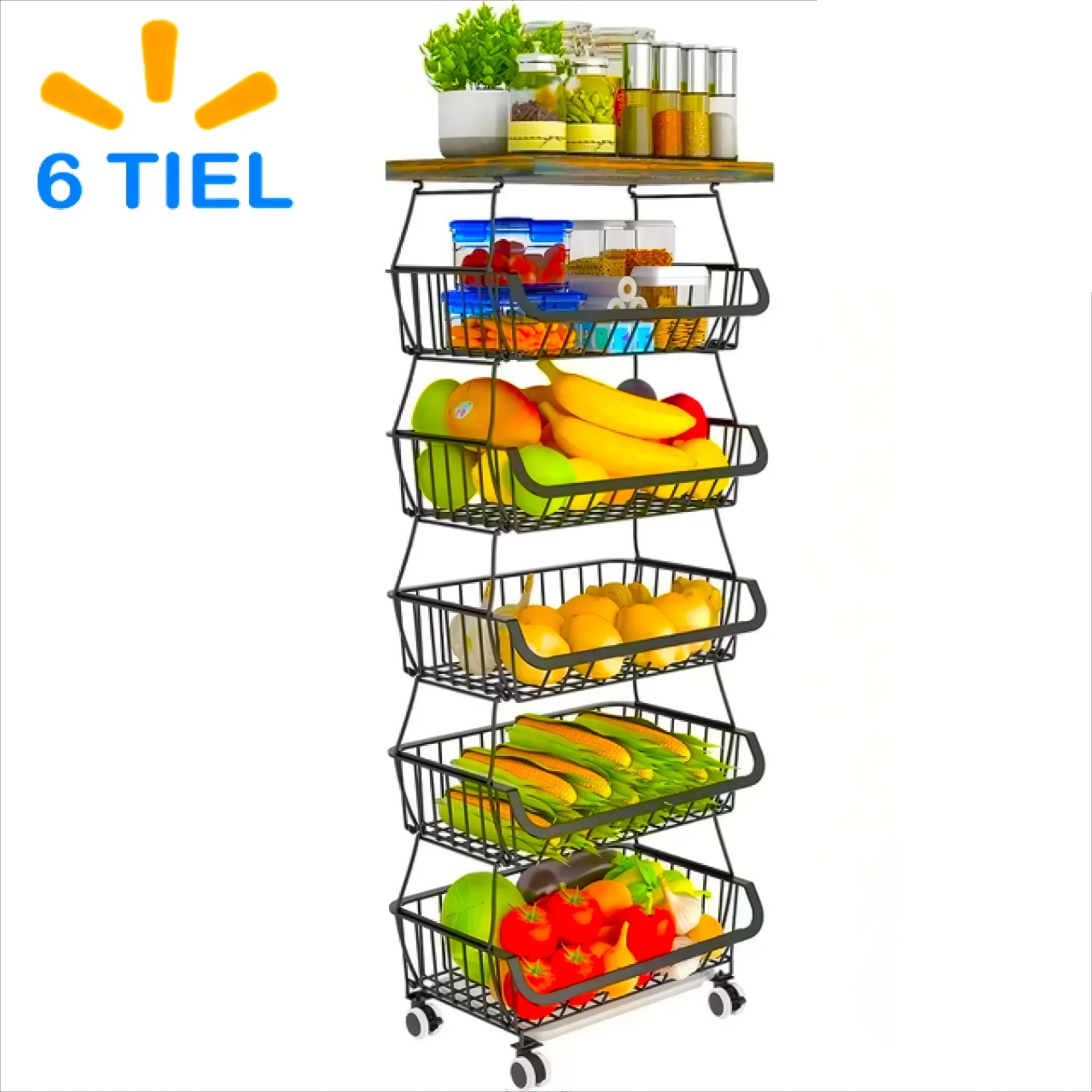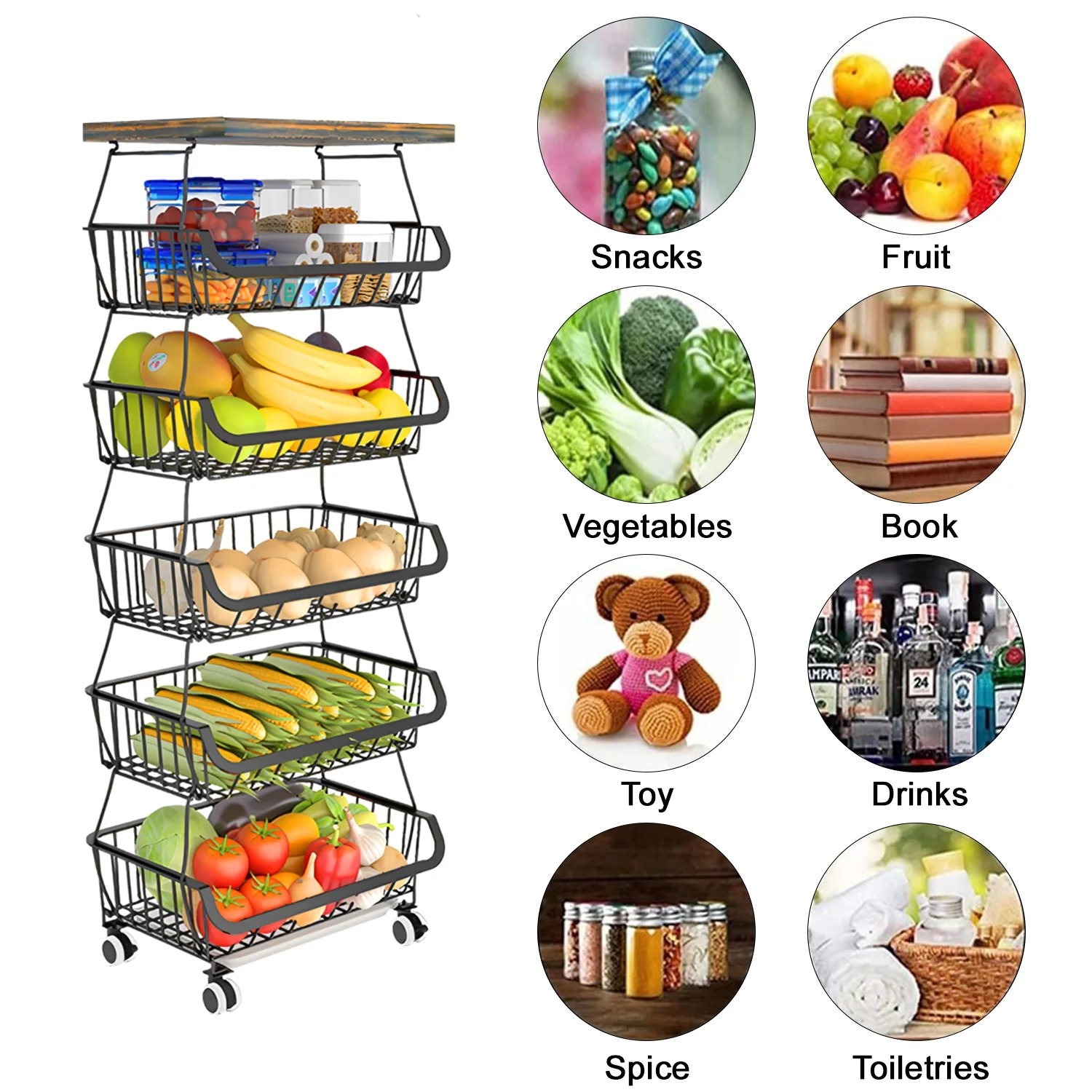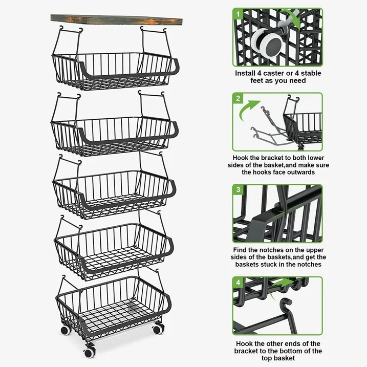 This storage rolling basket cart can be stacked in different layers. Its space saving features and powerful storage the ability makes it a home helper, suitable for kitchen, living room, dining table, toilet. Multifunctional Cart Perfect storage solution for fruit organizer, production basket, vegetable storage, potato box. Multifunctional hanging rack is enough to store documents, letters, bills, books and magazines, kitchen, storage room, garage, bathroom, living room. Top with solid wood to increase the weight of the kitchen trolley for cooking utensils and toasters. Place anywhere in your home as a floor-standing basket organizer or rolling cart. Heavy Duty Stackable Wire Basket Made of sturdy metal, it is rust-proof and durable, perfect for storing everyday items. Each basket organizer is removable and stackable. you can freely combine the baskets to match your cabinet height. High quality wheels provide good load carrying capacity. This kitchen wire vegetable rack has 4 swivel wheels (two with brakes) for easy transport and 4 adjustable feet. Fruit and Vegetable Cart The mesh design ensures ventilation and provides a dry environment for storing fruits and vegetables, preventing the food from spoiling easily, no odor and easy cleaning. Wheels under the basket help you move and place the shelf easily. 360� movable rolling cart. two casters are lockable to keep the storage organizer securely in place when needed. Easy to Assemble Easy to install, each basket can be removed from the stand when hanging, and can be stacked on each other with a buckle design, the kitchen vegetable baskets can be used alone or stacked one by one for easy storage. The top is made of antique wood planks with rounded safety corners, thickened, waterproof and removable for easy cleaning.
